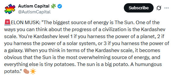 After claiming that we have achieved technological singularity, Elon introduces the World to another concept from futuristic discource. Kardashev Scale was developed in 1960s by the Soviet astrophysicist, Nikolai Kardashev as a typology of extraterrestrial civilizations.