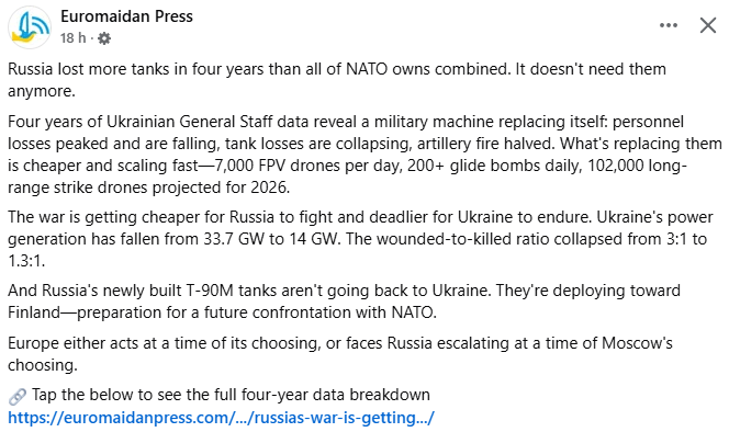 The cheap ass drones have made the tanks less relevant. Tanks are still OK, they work very well against snipers in the city but in open terrain they are easy targets for drones. And Russia these days employs a different strategy. It employs small squads of storm troopers, sometimes on light vehicles or motorcycles. It scouts for drone operators, and annihilates the latter with short range missiles like Iskander, or rocker artillery. Glide bombs, rocket artillery guided by drones is the name of the game.