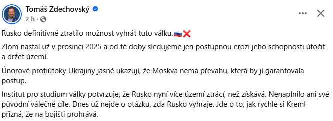 Czech MEP Tomáš Zdechovský says that the breaking point for Russia began in 2025, and we are witnessing erosion of Russia’s ability to attack and maintain control over territory. February counterattacks of Ukraine demonstrate that Moscow doesn’t have the upper hand that would guarantee its advance. The Institute for the Study of War confirm that Russia now loses territory more than it gains. Russia did not achieve its initial goals. Today, the question no longer stands whether Russia wins the war. The question is how fast will the Kremlin admit that it is losing… 😆👌