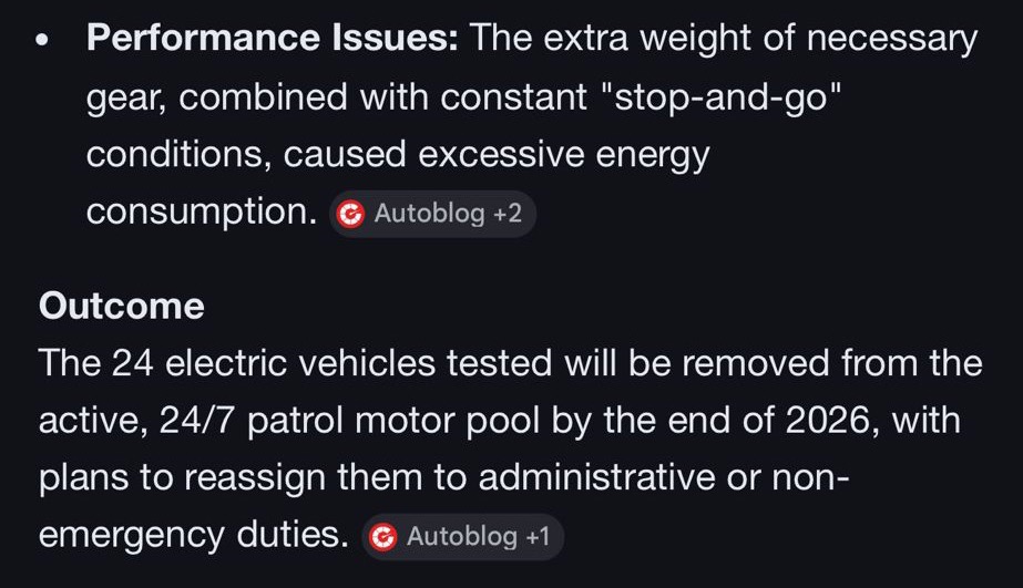 The performance issues do not end there. It seems that EVs are totally useless as a police car. The problems center on the battery. The weight is a major problem. And this is why I think EVs will never fully take over. They aren’t good for the police, they aren’t good for the military. The conflict in Ukraine has shown that you need fast moving, manœuvrable, and light vehicles to move troops. You could probably have a hybrid with a small battery because I heard that releases less heat, and would hide the vehicle from thermovision.