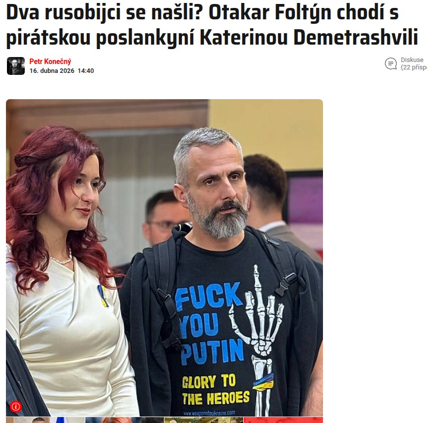 Two Russia bashers found themselves. Otakar Foltýn is going out with Katerina Demetrashvili. Katerina’s dad is Georgian and he is fighting the Russians in Ukraine. Katerina is a member of the Czech Parliament and Otakar is a military adviser to the president, Petr Pavel. He is an officer in the Czech military.