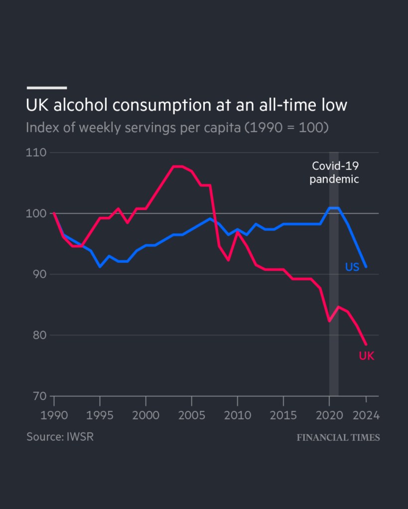 So, people aren’t consuming alcohol as they did. Media attribute this a lot to Gen Z being more health aware, 😂 or financial situation. Well, Gen Z is vaping like there is no tomorrow, drugs like marijuana are also very popular among them, I would not say they are health aware, and alcohol is actually very cheap in shops. It is the pubs and bars that spike the prices.