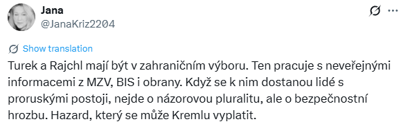 Turek and Rajchl are likely to be in the foreign committee. The committee works with classified information from Ministry of Foreign Affairs, BIS (the secret service), and defense. When people with pro-Russian views get to this information, it is not just a question of plurality of opinions but a security threat. It is a hazard that the Kremlin can profit from.