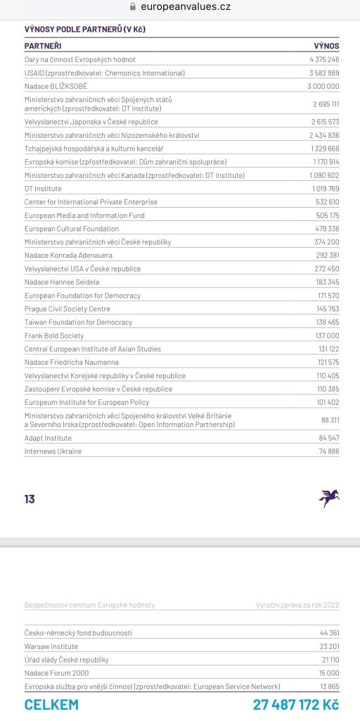 The above are mostly donors from among government and private organizations. The biggest donor is USAID. Then comes a private Czech foundation but following that, the US State Department. Then comes the Japanese Embassy in the Czech Republic. Then the Dutch ministry of foreign affairs. The Taipei Economic and Cultural Office. The European Commission. The Canadian foreign ministry. DT Institute. Center for International Private Enterprise. European Media and Information Fund. European Cultural Foundation. The Ministry of Foreign Affairs of the Czech Republic. (Muh taxes) Konrad Adenauer Foundation. US Embassy in the Czech Republic. Hanns Seidel Foundation. European Foundation for Democracy. Taiwan Foundation for Democracy. Frank Bold Society. Central European Institute of Asian Studies. Friedrich Naumann Foundation. South Korean Embassy in the Czech Republic. The office of the European Commission in the Czech Republic. European Institute for European Policy. UK foreign ministry. Adapt Institute. Internews Ukraine.