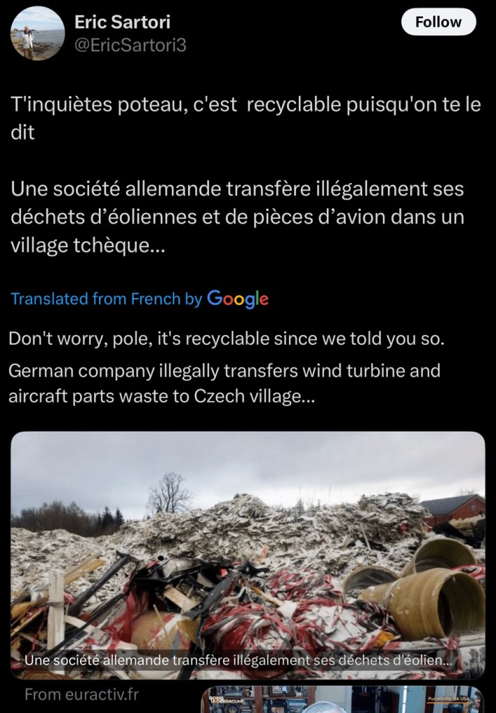 Finally somebody said it about the fucking windmills that our governments want to place everywhere in the name of saving the planet. These windmills kill birds, they cannot be recycled and their steel, concrete pedestals will be there forever. There are better wind harvesting techniques out there that should receive more attention. By the way, I have seen reports that the waste from these decommissioned German windmill plants ends up here in Czechia.