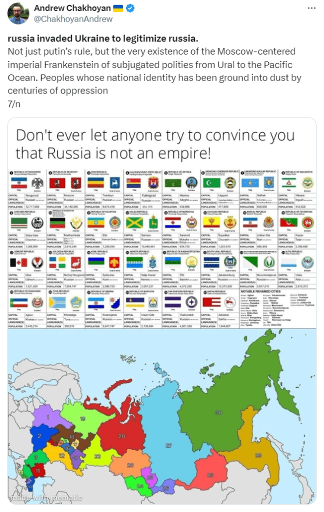 While some unfortunate Ukrainian men are on the front, some are busy on the Internet. This project for instance pushes for decolonization of Russia, that is breaking Russia up along ethnic lines, and perhaps create other Ukraines out of ethnically Russian territories.