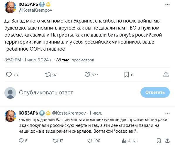 Yes, the West helps Ukraine in many ways, thanks, however after the war we will long remember something else: how you did not give us air defense in needed volumes, how you were stingy about Patriots, how you did not allow us to strike deep into Russian territory, how you welcomed Russian officials on your territory, your fucking UN, and most of all…