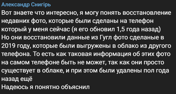 You know what is interesting. I can understand the restoration of recent photos, which were made with a phone that I currently have (I have renewed the phone 1.5 years ago). But they have restored data from 2019, which were uploaded into cloud from another phone. That is, there cannot be a mention of these photos on the phone because they exist in the cloud but were deleted already a year ago. I hope I explained it clearly. 😆