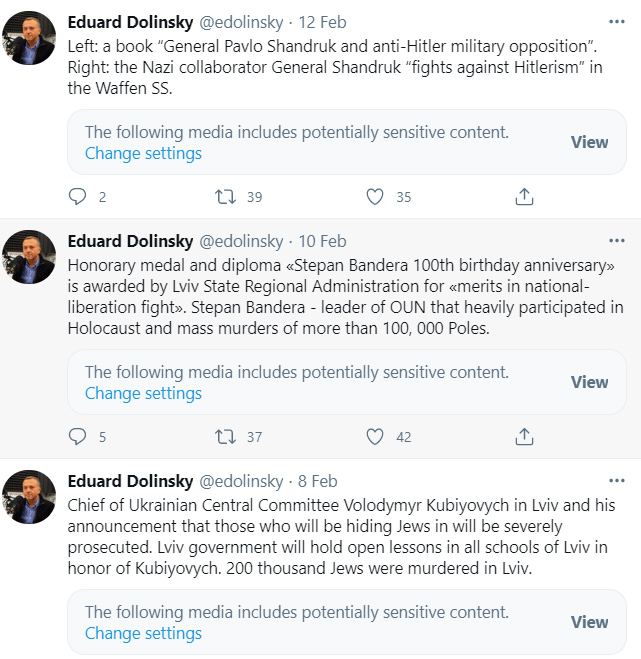 Now sometimes, the social media engage in a strange obstruction of content. Eduard Dolinsky is the head of the Ukrainian Jewish Committee and regularly posts information regarding the rampant rehabilitation of Nazi collaborators in Ukraine. This is what his Twitter page looks like when you load it…
