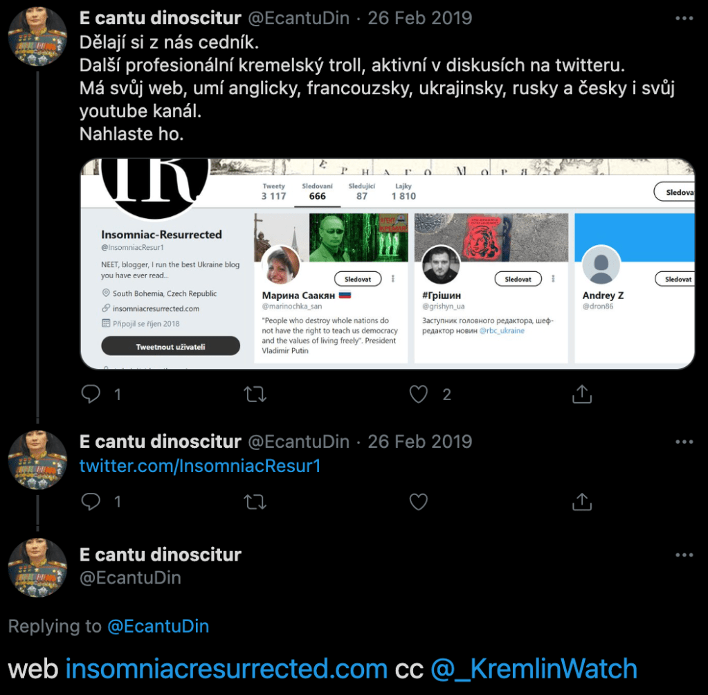 They are fucking with us, another professional Kremlin troll active in debates on Twitter. He speaks English, French, Ukrainian and Czech. Has a website and a YouTube channel. Report him!!!
