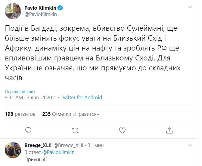 Ukraine’s former foreign minister, Pavlo Klimkin, says the killing of the Iranian general will take the focus off Ukraine, and will make Putin rich…