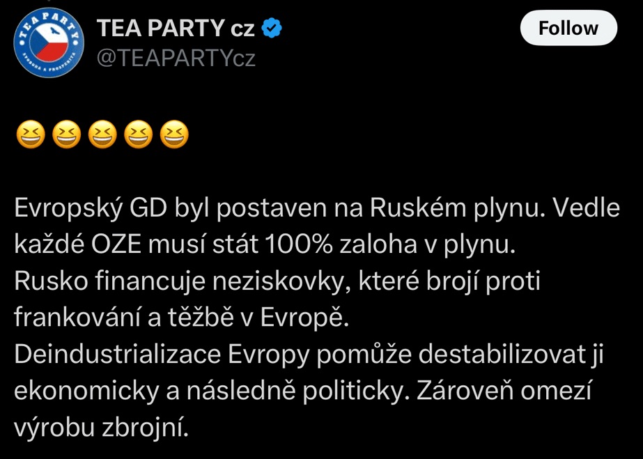 At the right part of the spectrum, where people do not care as much about fags. The people are blaming the Green Deal on Russian interference and are saying such policy is designed to weaken Europe in the face of Russia. In the meantime, the greens in Germany and even here in Czechia are staunch atlanticists. Rightoid and traditional socialist parties want to import Russian gas.