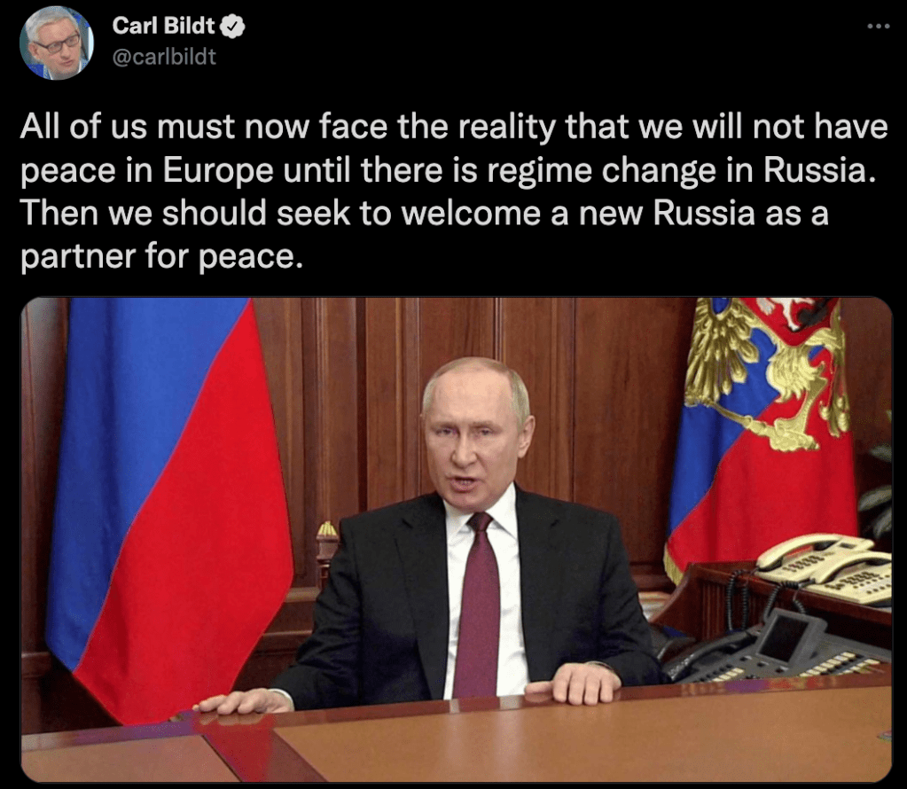 Russian victory over Ukraine will be a massive blow to the credibility of people like Bildt that have instigated the current war with the vision of bringing Russia to it knees and prolonging the US hegemony. Talks about Chinese yokes, or future Ukrainian resistance are massive copes. Russia had the same relationship with the EU as it does with China. Basically Russia supplies resources and these countries supply value added goods that Russia does not make. The Ukrainians don’t give a fuck about being ruled by Russia, only a handful of nationalist fanatics. Russia will kill them…