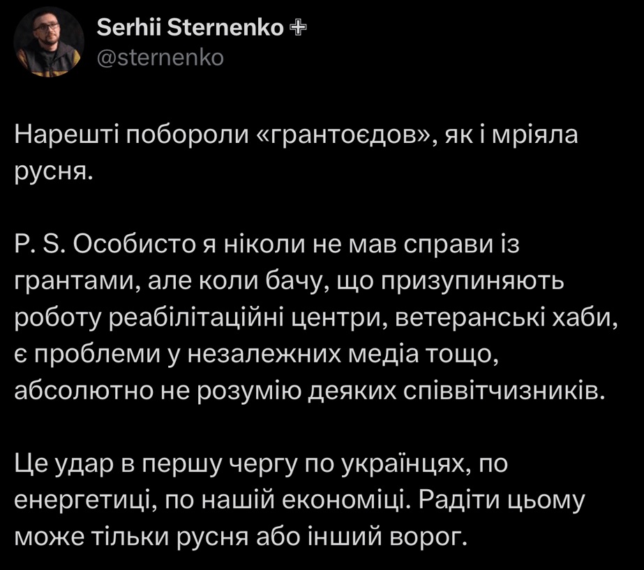 P.S. I have never had any deals with grants but when see that the work of rehabilitation centers, veteran hubs, there are problems at independent media, then I completely don’t understand some of my fellow countrymen.