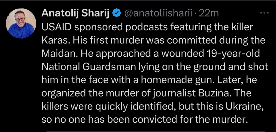 Evhen Karas’ -Ukrainian Neonazi will probably stop doing podcast because he was also funded by USAID. Speaking of which, Sternenko is not telling the complete story, when he says he was never a beneficiary of grants, he was definitely a beneficiary of the granteating infrastructure created in Ukraine. As documented on this blog.