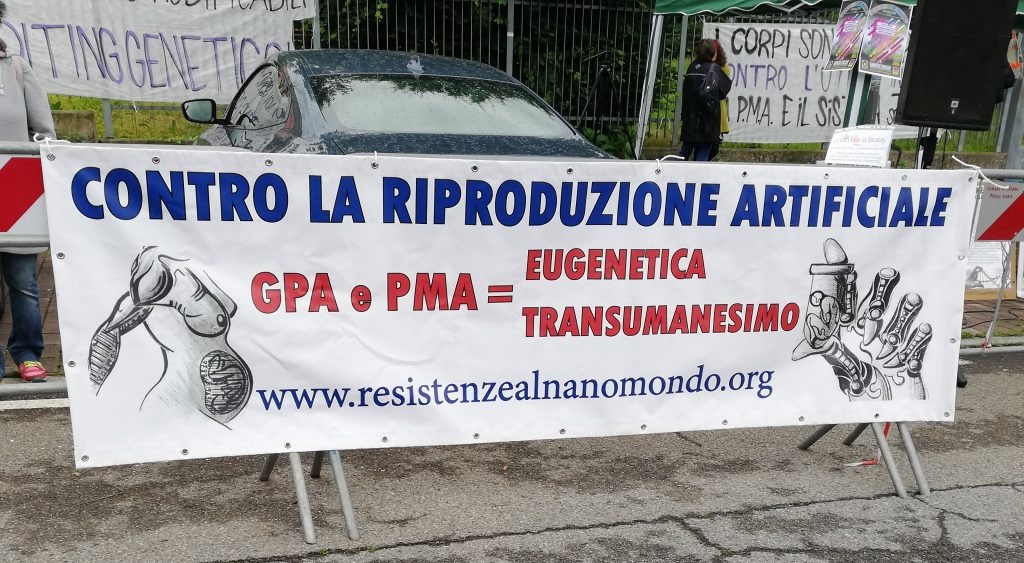 Resistenze al nanomondo and FINAARGIT – International Feminist Network Against All Artificial Reproduction, Gender Ideology and Transhumanism – were joined by the Popular Assembly Resisting Transhumanism of Bergamo in organizing a “sit-in” protest.