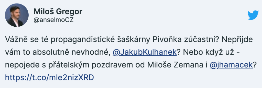 Is it true Pivoňka will attend the propagandistic clownery? Don’t you think this is absolutely inappropriate Jakub Kulhánek (the Czech foreign minister)? Is it a substitute for Mr. Hamáček (the Minister of Interior) not coming to Moscow with a friendly greeting from Miloš Zeman?