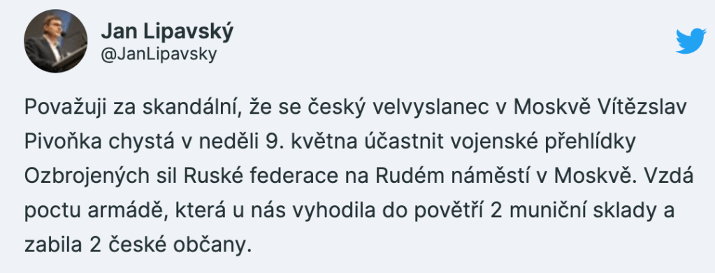 I consider it scandalous that the Czech ambassador in Moscow, Vitězslav Pivoňka is planning to attend the Russian Military Forces parade on 9. May. He will honour the army that blew up to ammunition storages and killed two Czech citizens.