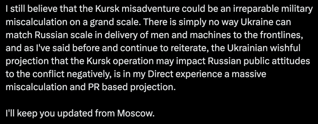 Again these North Koreans. It is clear Russia didn’t use its elite forces or withdraw troops fighting in Ukraine to deal with Kursk. If they managed to draw North Koreans to this theatre that would be based but the evidence for this isn’t trust worthy from my point of view.