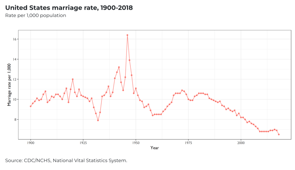 Guess why? No fault divorce! These days, marriages can be ended over the simple desire of your honey boo to fuck some Chads and Tyrones. She gets a lawyer, takes the house, the dog, the kids, gets child support from you sucker + alimony allowance.