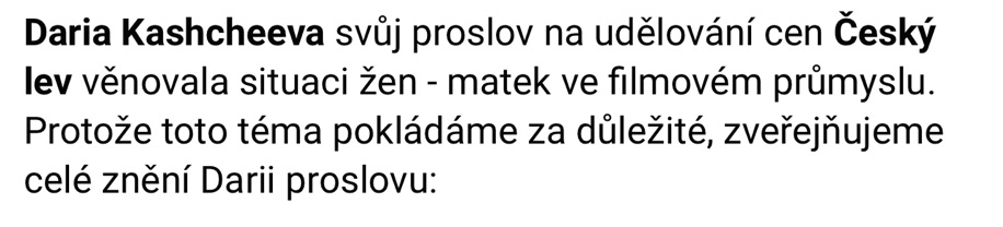 Daria Kashcheeva: Her speech at the Český lev awards has been dedicated to the situation of women – mothers in the film industry. Because we consider this topic important, we are providing the entirety of Daria’s speech.