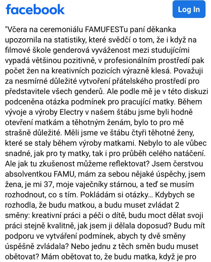 Yesterday at the ceremony of FAMUFEST (FAMU is the film academy), Mrs. deacon mentioned statistics according to which the gender balance among the students is mostly positive, in the professional life, the number of women in creative professions is decreasing. I consider it extremely important to create a friendly environment for the representatives of all genders. But I consider that the question of conditions for working mothers underestimated. During the development of Electra, we have been very open to mothers and pregnant women, it was very important for me. We had in our team four pregnant women, who have become mothers during production. It wasn’t at all easy, for the mothers, and for the entire pace of the production. But how can we assess the situation? I am a fresh graduate of the FAMU, I have some successes behind me, I am 37, my ovaries are aging, and now I have to decide what to do with it. I am asking, if I make the choice to become a mother and I would I have to manage two shifts: the creative work and child care, will I be doing the work as well as before? Will I get any support in creating conditions to successfully manage the two shifts? Or will I be forced to dump one of these shifts? Do I have to sacrifice being a mother if creative activity is very important for me? Or do I have to sacrifice my creative activity? But why do I even have to make a choice between motherhood and creative activity? Only because I was born with a womb. I hear it already, you can do it, all the women managed to do it… but at what cost? At the cost of quality of my creations? Or the quality of the upbringing of my child? At the cost of burnout and the inability to further create or be a mother? In Nordic countries it is slowly becoming a standard, to count into production budgets the cost of nannies and children spaces, so that the mother are able to present their films. In Czechia, the women have to organize it themselves, or to pay for babysitting from their own salary, which means their overall salary and living standard decreases… again… Just because she was born with a womb and her breasts produce milk? I hope that steps towards the support of creative women – mothers will be taken here in Czechia and we will see more gender balance in creative professions.