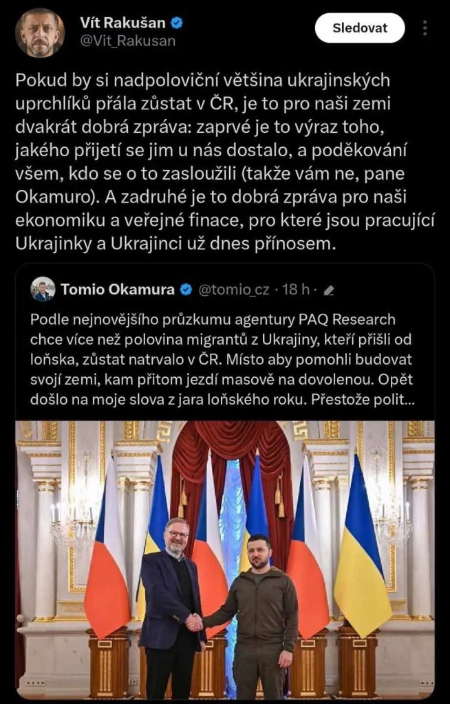 So, the leader of an opposition parliamentary party, the SPD, Tomio Okamura wrote on Twitter that more than half of the Ukrainian refugees don’t want to go back to Ukraine? To which the minister of interior, Vít Rakušan, replied that this is actually good. He says that the Ukrainians will be a benefit to the economy and public finances. That is more working hands, and more taxes.