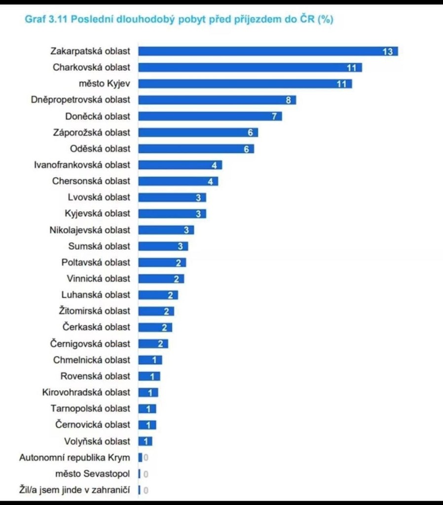 Transcarpathia is the former Czechoslovak province of Podkarpatská Rus (RUS). It is the Western most region of Ukraine. It is partially settled by Hungarians, and the Slavic locals have a vernacular that is hard for me to understand. It became a part of Ukraine in 1945. If you ask me, maybe I have missed it but I cannot recall Transcarpathia being targeted by rocket or drone strikes. The nearby Lvov, north of the Carpathian range experienced dozens of strikes. I kind of get that men flee recruitment. Besides, I don’t care about people milking the Czech state like this, the powers that be put their full support behind Ukraine, so this could not happen to a better government.