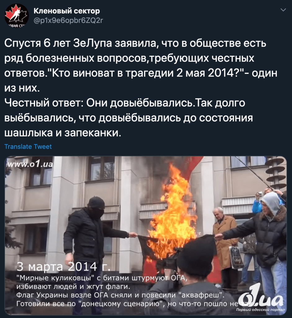 The Ukrainian Institute of National Remembrance does not shy from employing elements of historical invention in their work. It has to be remembered that the Odessan pro-Maidan crowd was unable to do anything about the Antimaidan protesters for many months, and the attack of 2 May was planned many weeks ahead and included help from other cities.