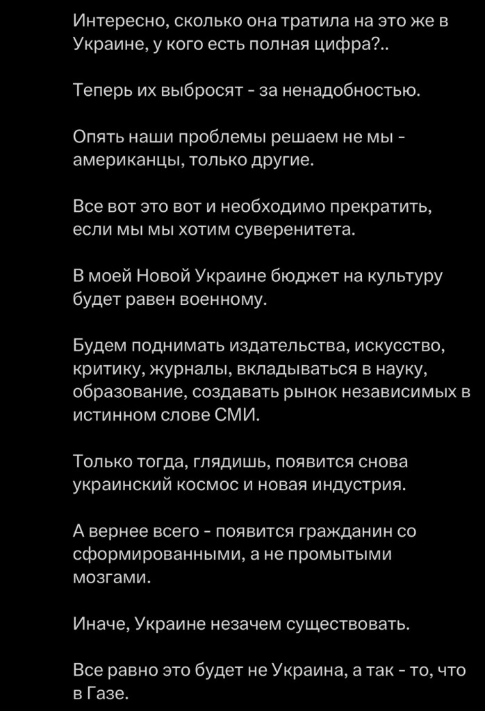 In my New Ukraine the cultural budget would be equal to the military (Russia is aiming to impose a military austerity on Ukraine, which would mean Ukraineâs military budget would be very small)
